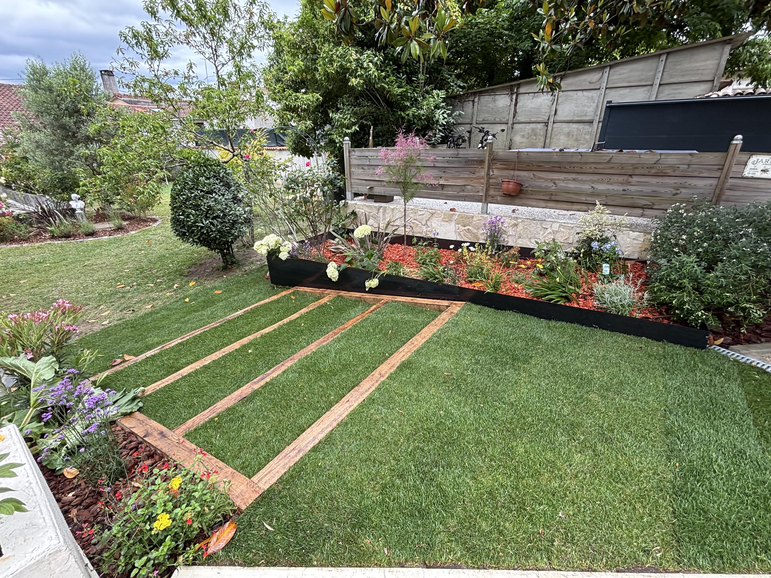 Nos équipes coordonnent toutes les étapes : terrassement, maçonnerie paysagère, plantations, arrosage intégré et finitions décoratives.