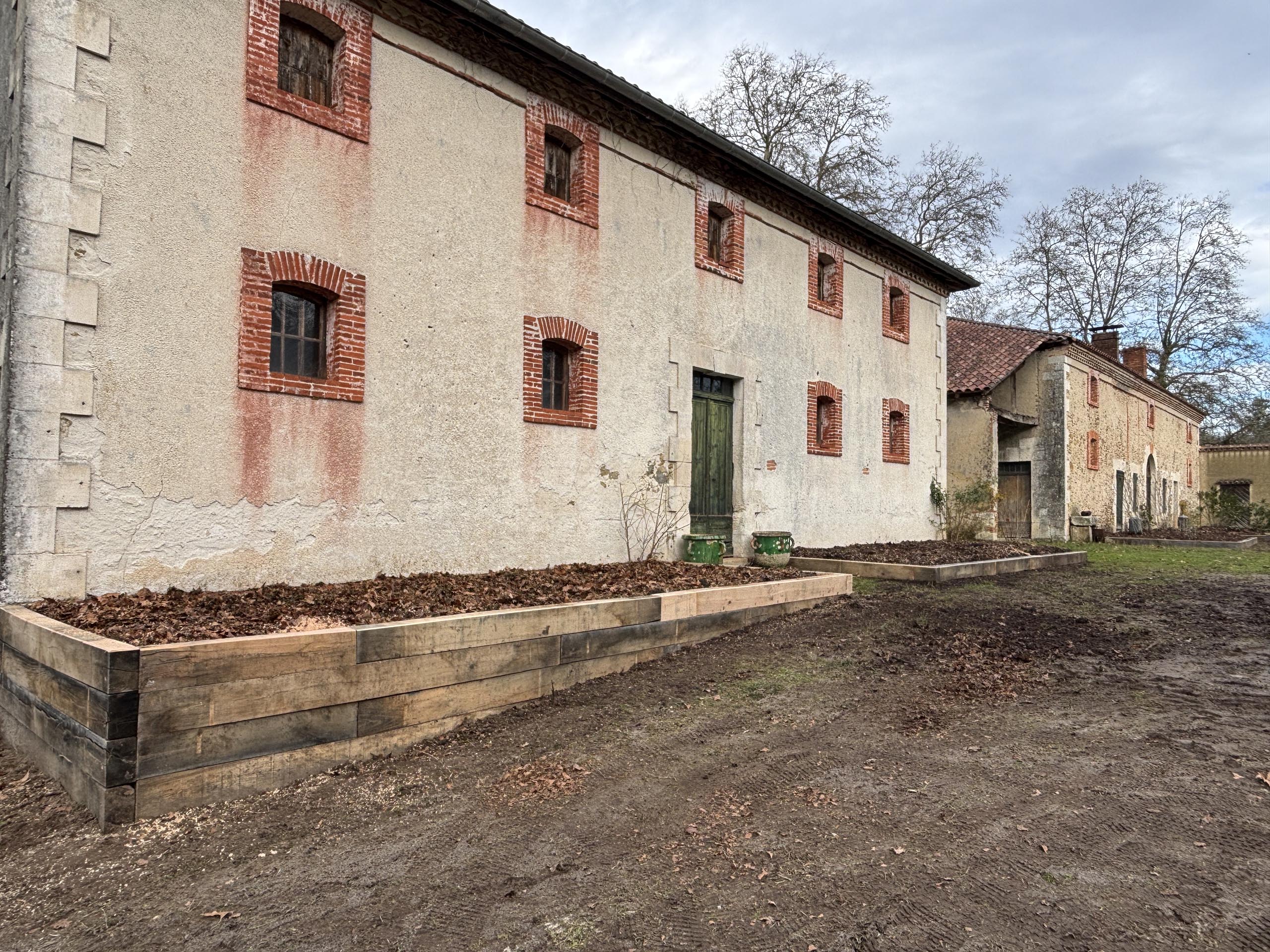 Nous avons réalisé des jardinières en traverses de chêne, travaillé les niveaux et apporté des matières naturelles ainsi que des végétaux variés. Ce type d’aménagement valorise le patrimoine et offre un espace extérieur authentique et chaleureux.