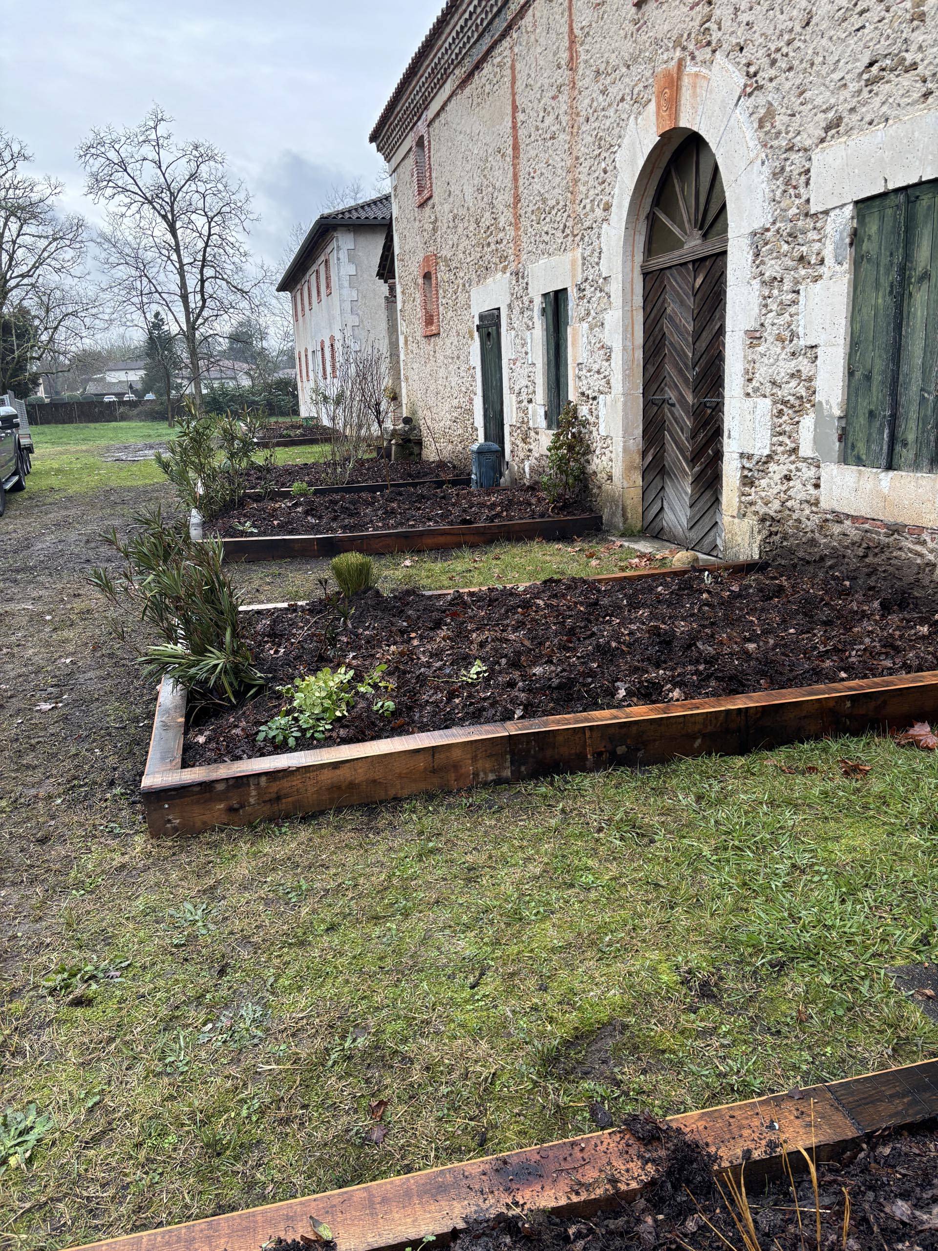 À Labrit, nous avons conçu un jardin à l’ancienne en harmonie avec des bâtiments de caractère. Ce projet a nécessité une implantation réfléchie et la définition des volumes pour créer un ensemble esthétique et équilibré.