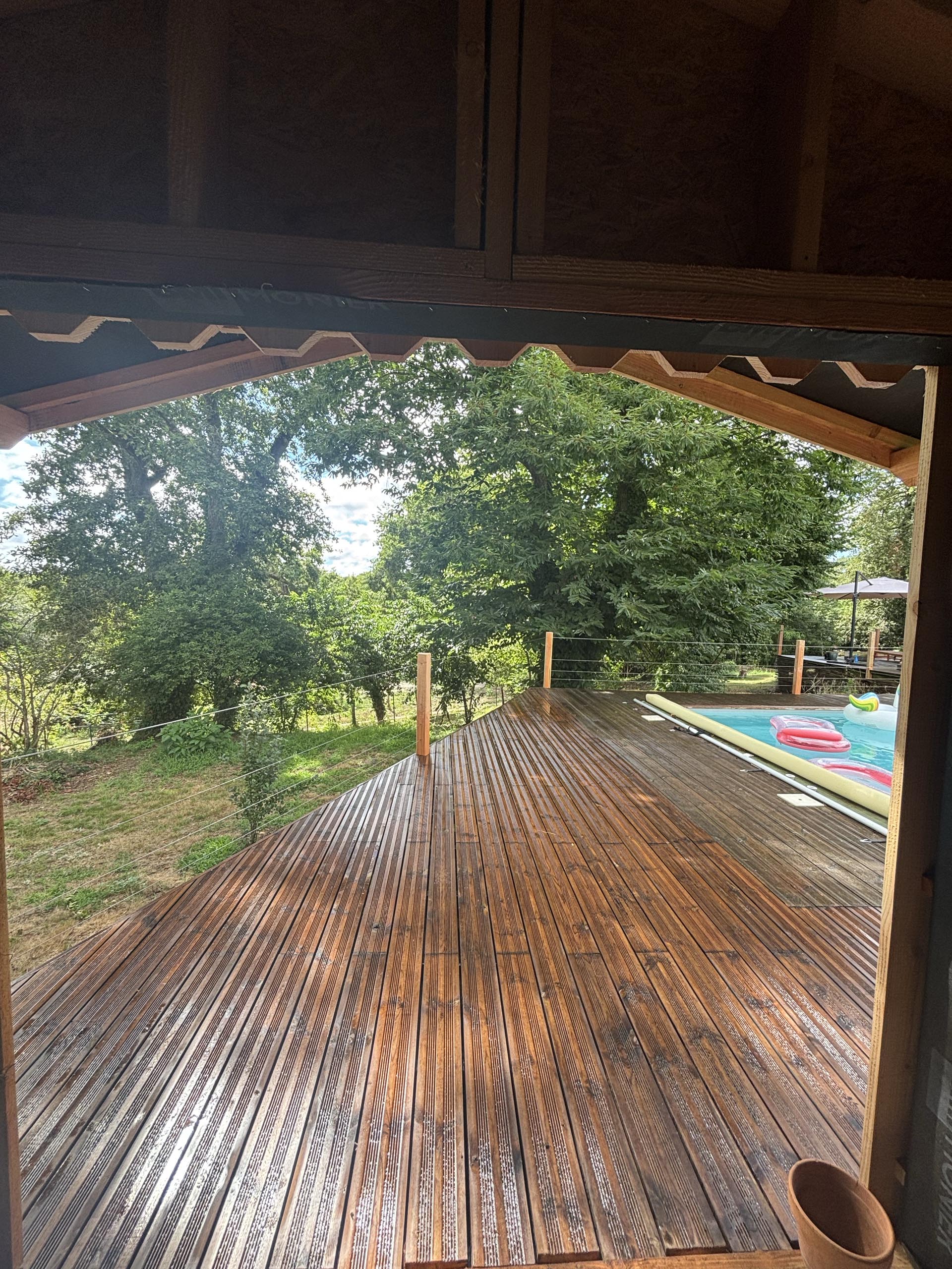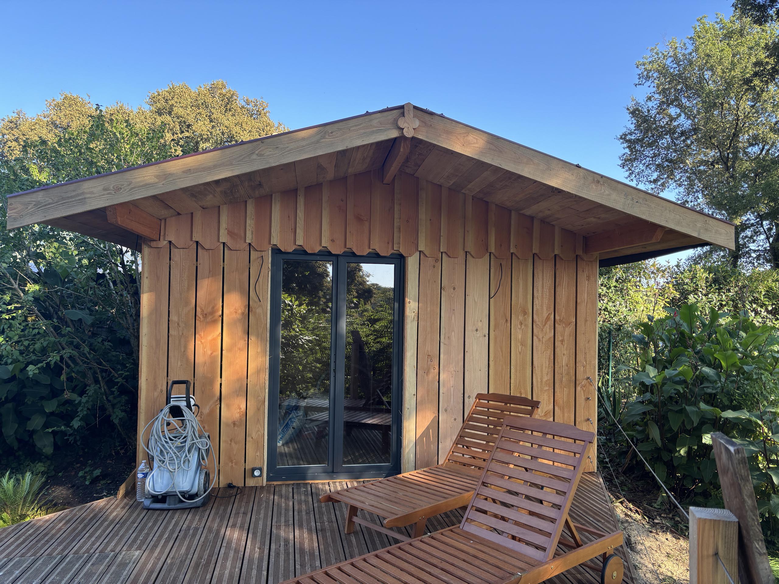 Création d’un pool house en bois Douglas avec terrasse et garde-corps inox