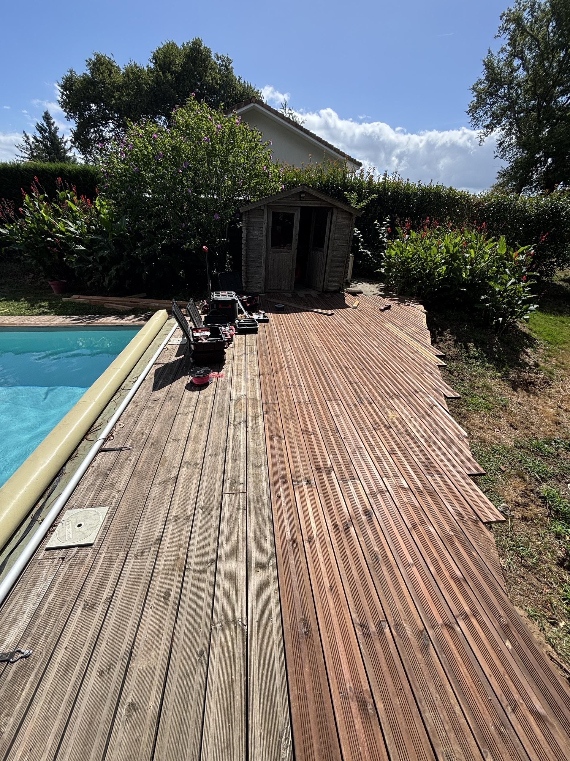 Pour harmoniser l’ensemble, nous avons prolongé la terrasse existante et ajouté un garde-corps léger en câble avec quincaillerie inox, garantissant sécurité et élégance. Ce type d’aménagement crée un espace convivial et esthétique pour profiter pleinement de la piscine et des beaux jours.