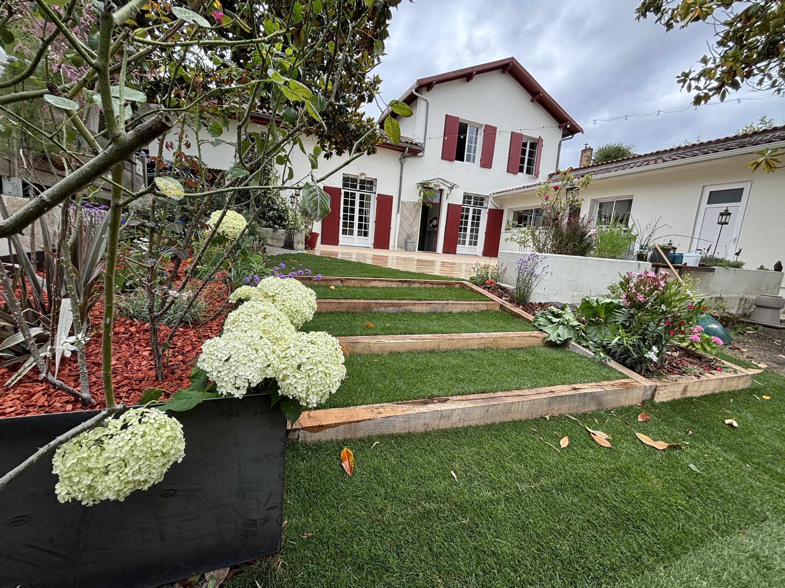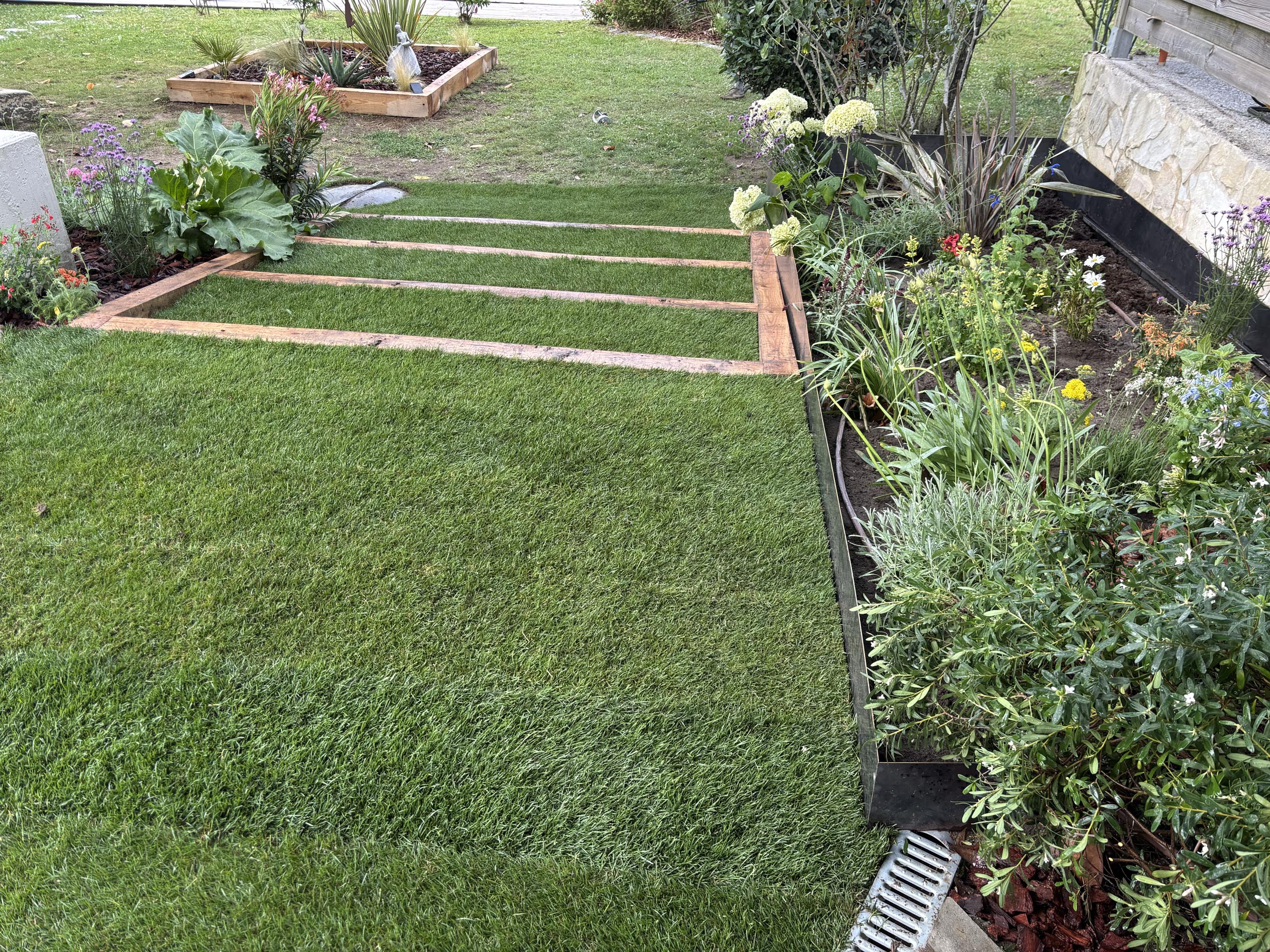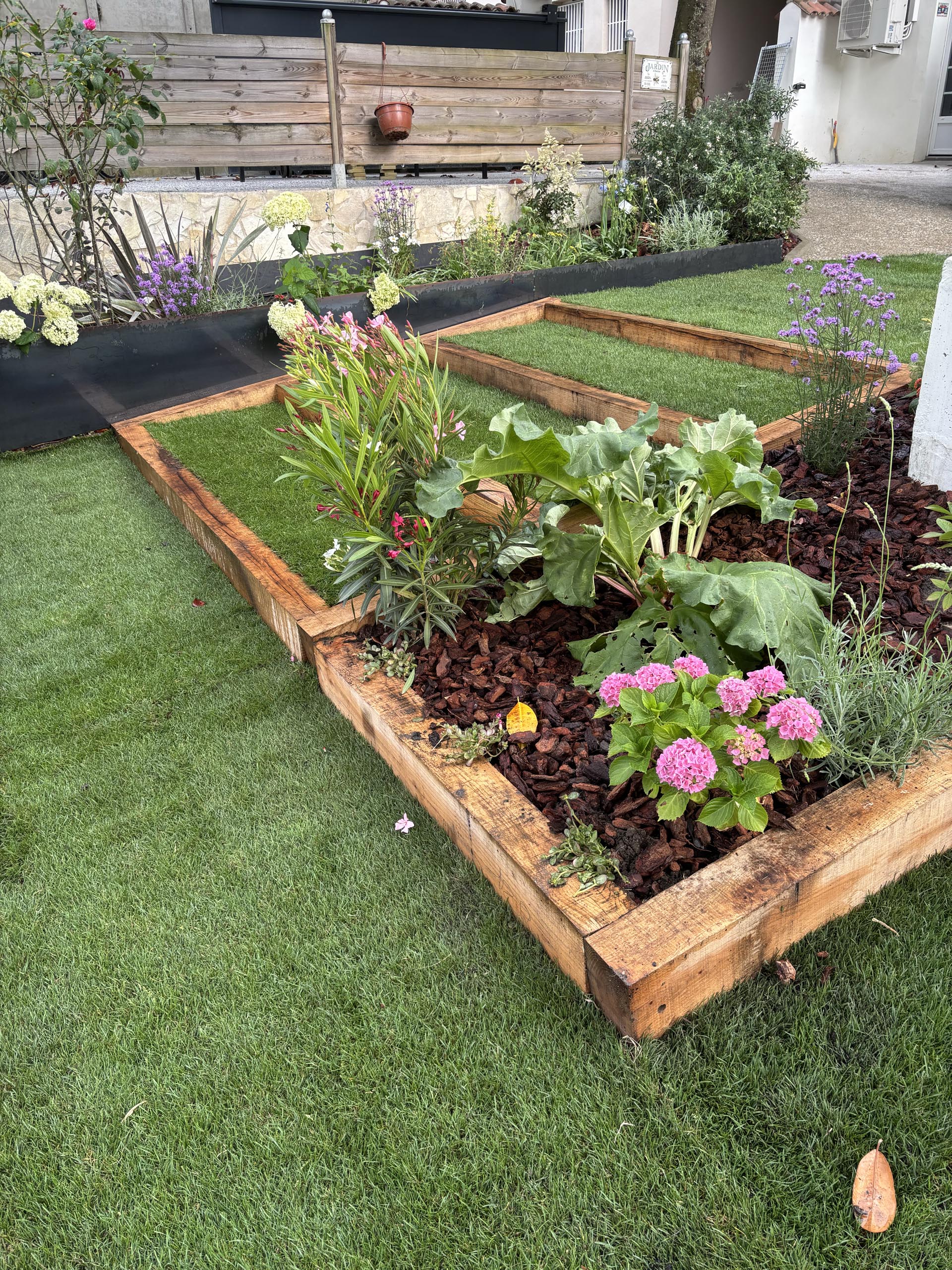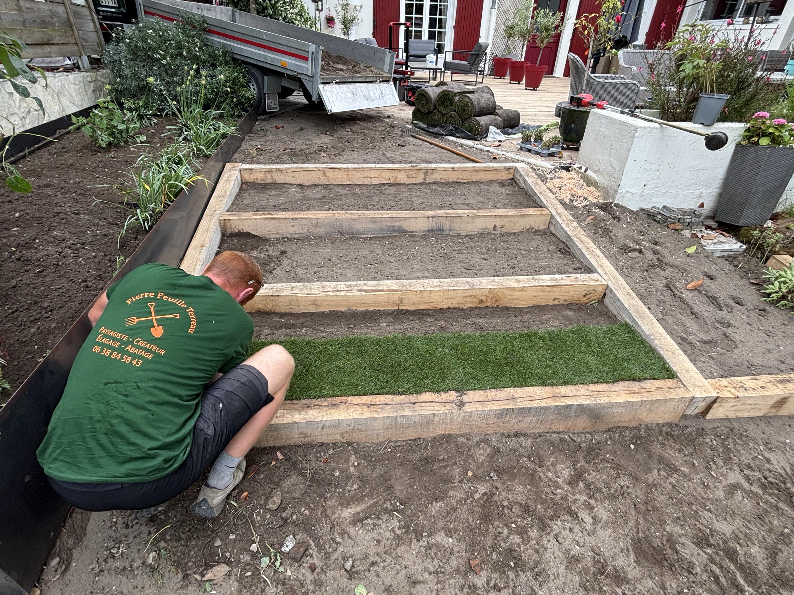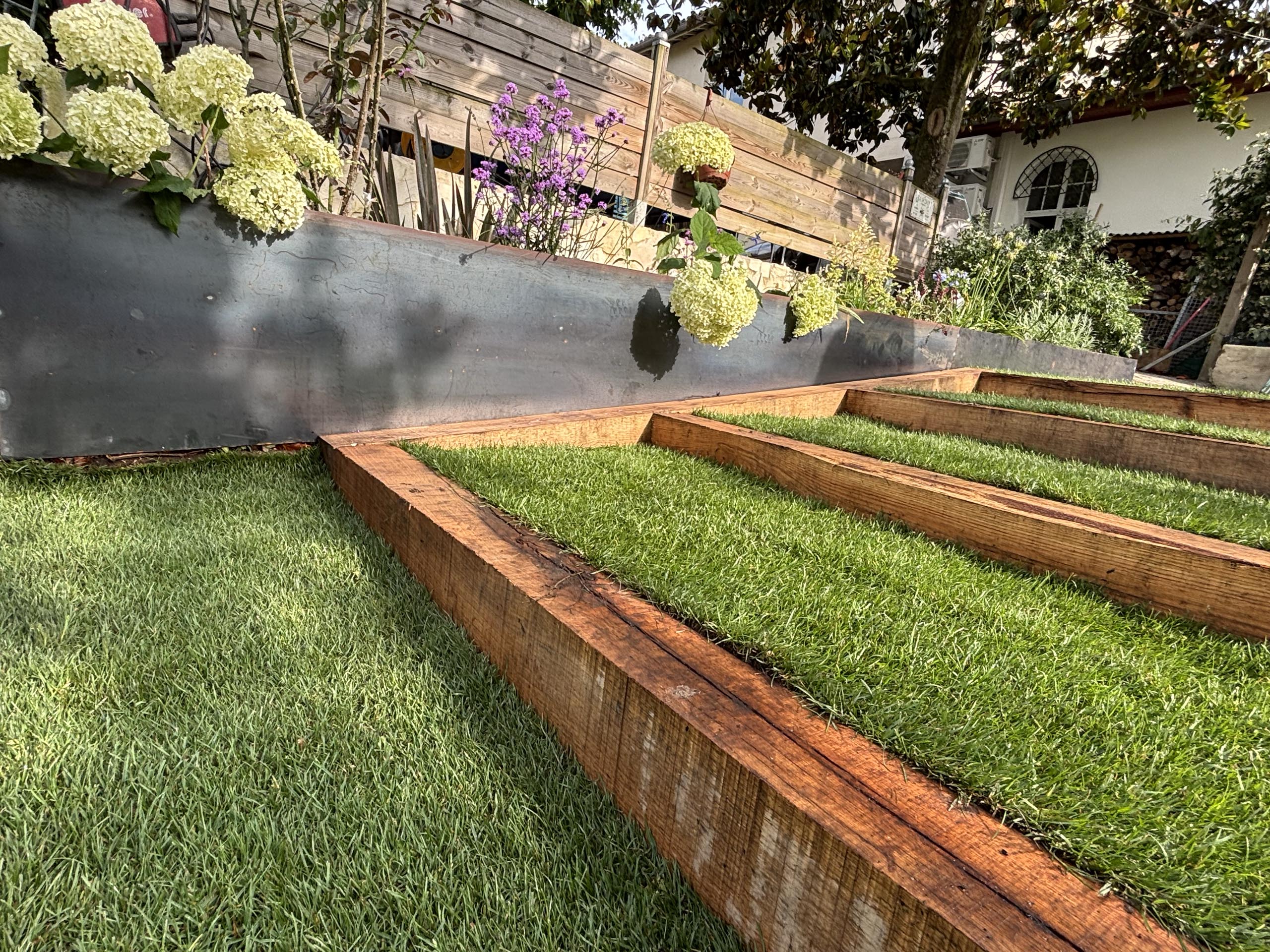 - Agencement sur mesure : Création d’espaces structurés avec marches en pelouse naturelle et traverses en chêne pour un rendu authentique.