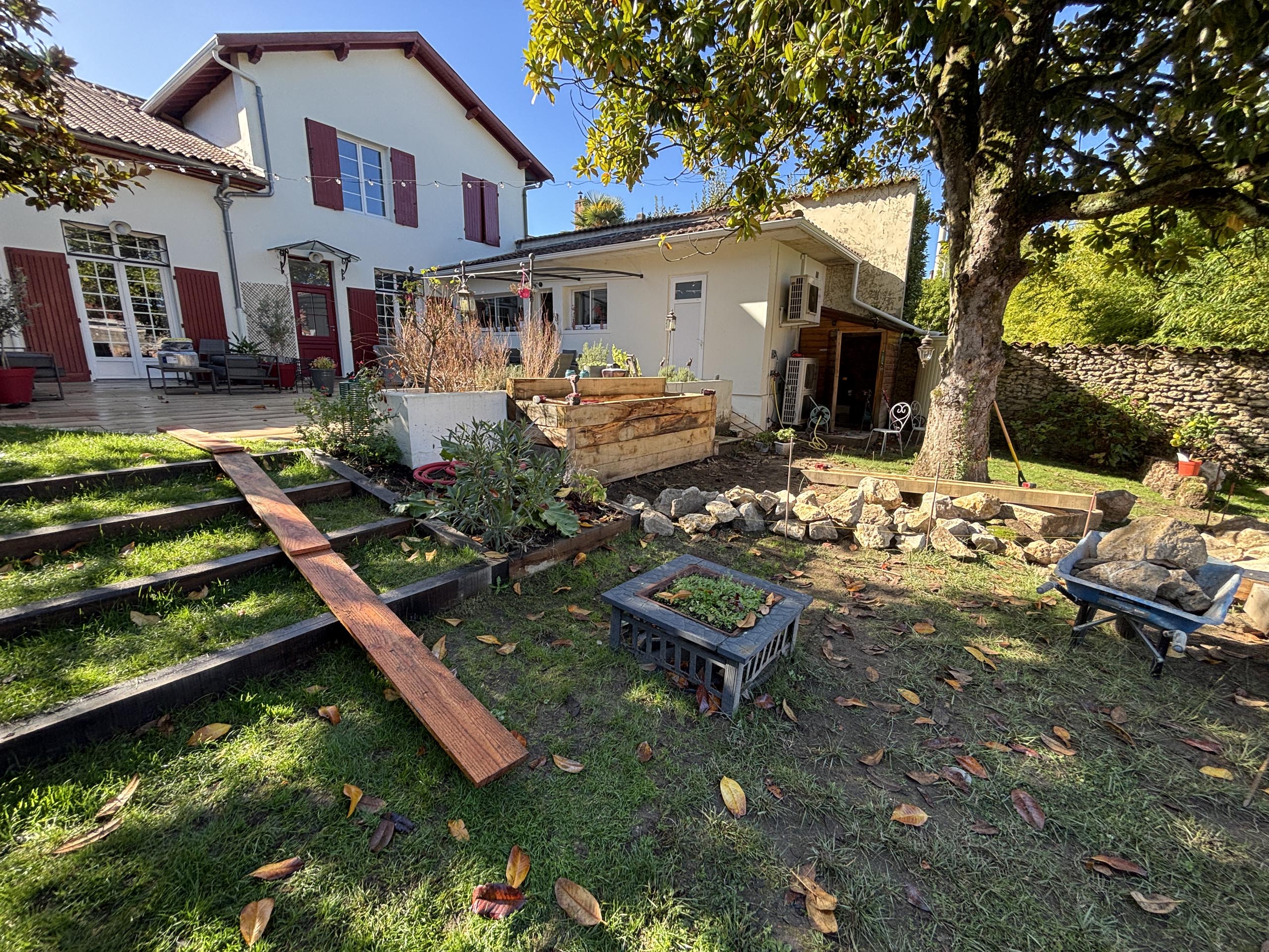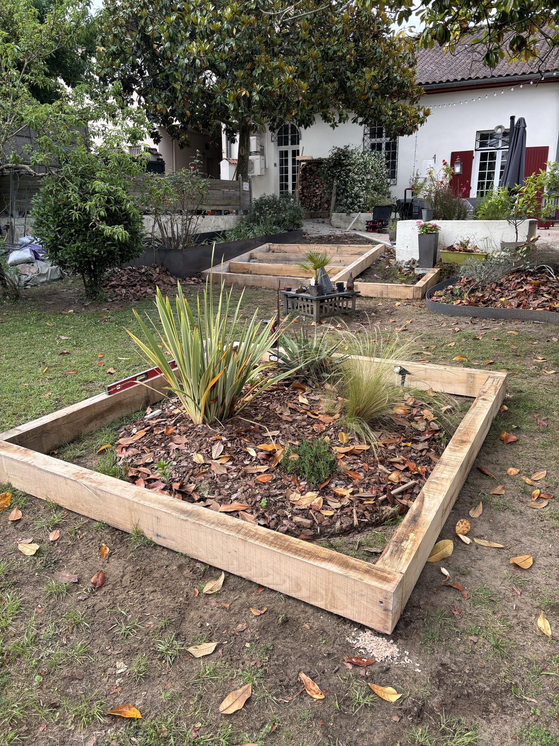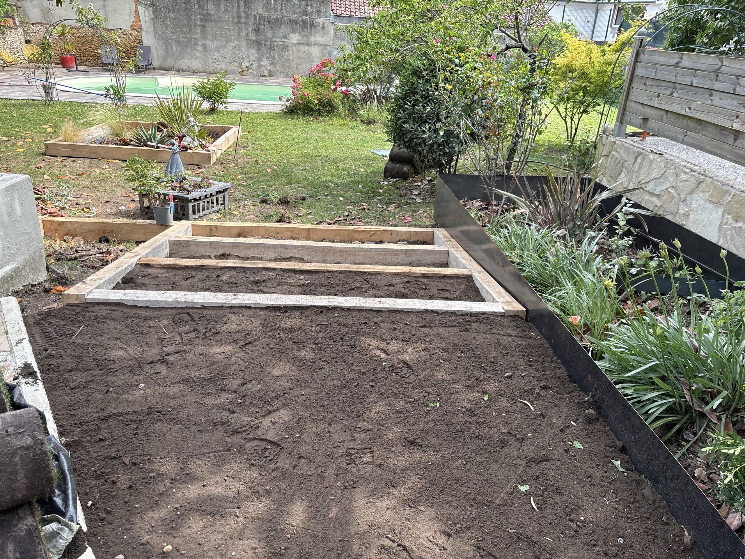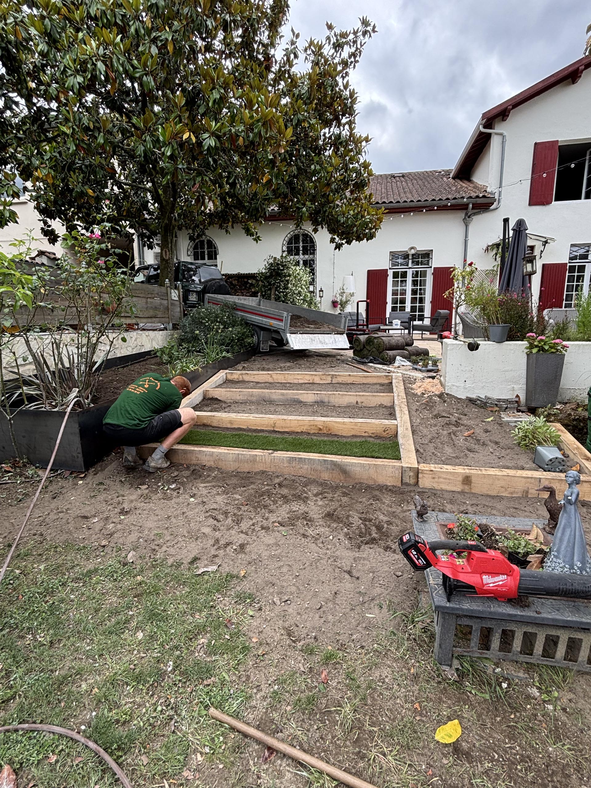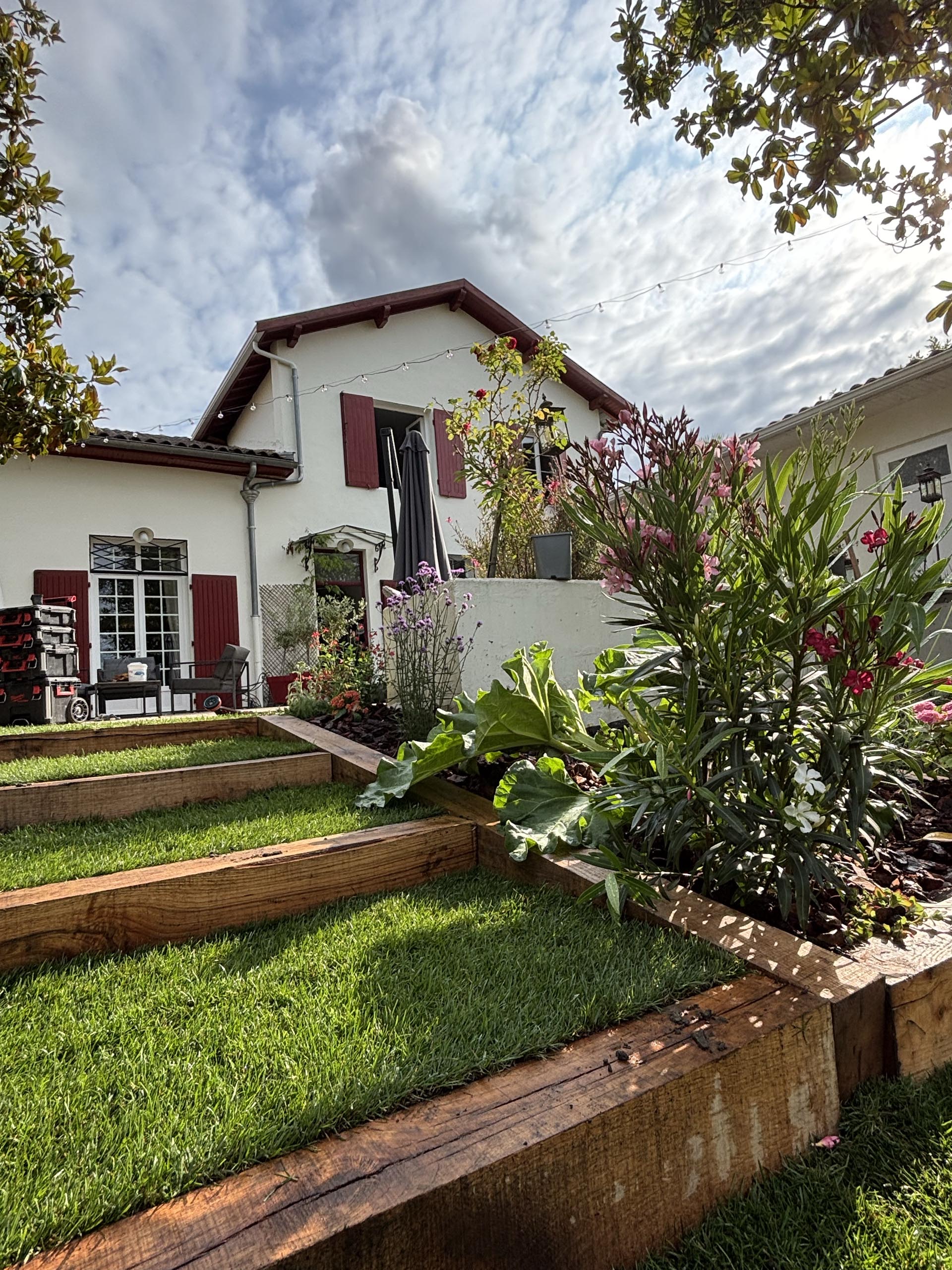 - Agencement sur mesure : Création d’espaces structurés avec marches en pelouse naturelle et traverses en chêne pour un rendu authentique.