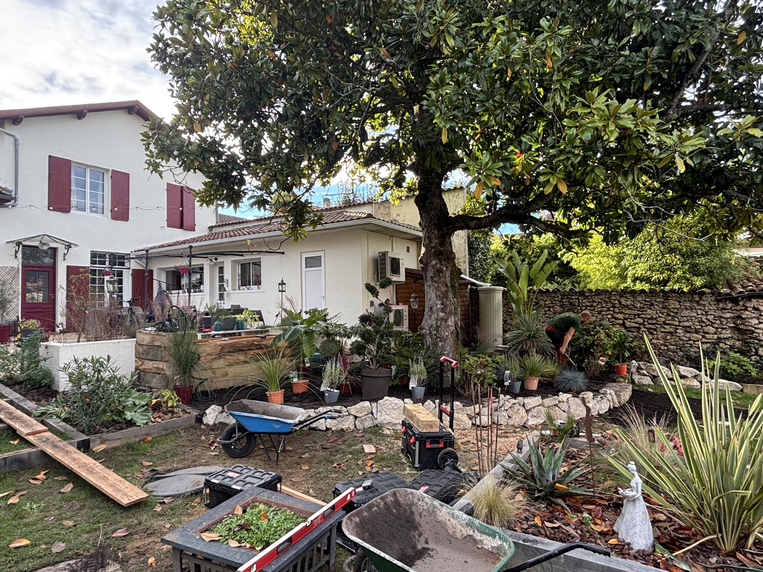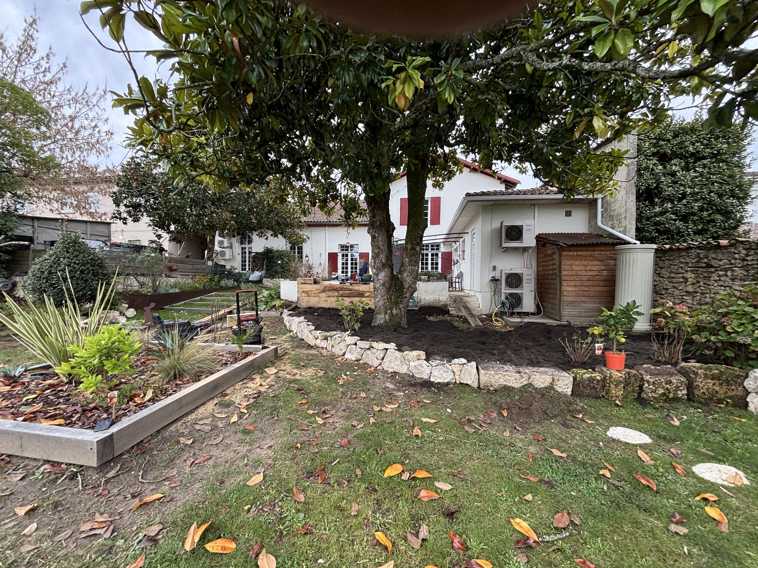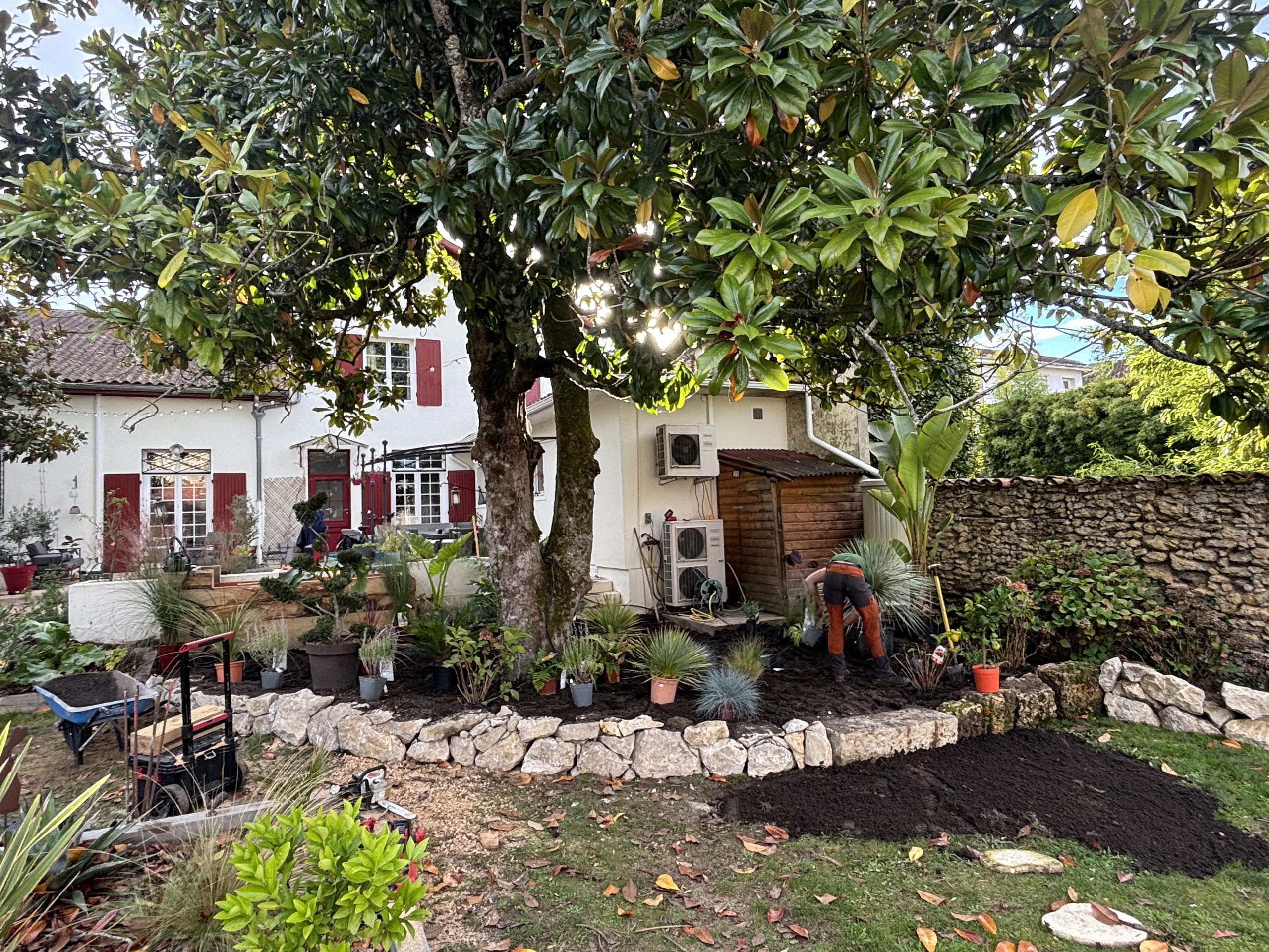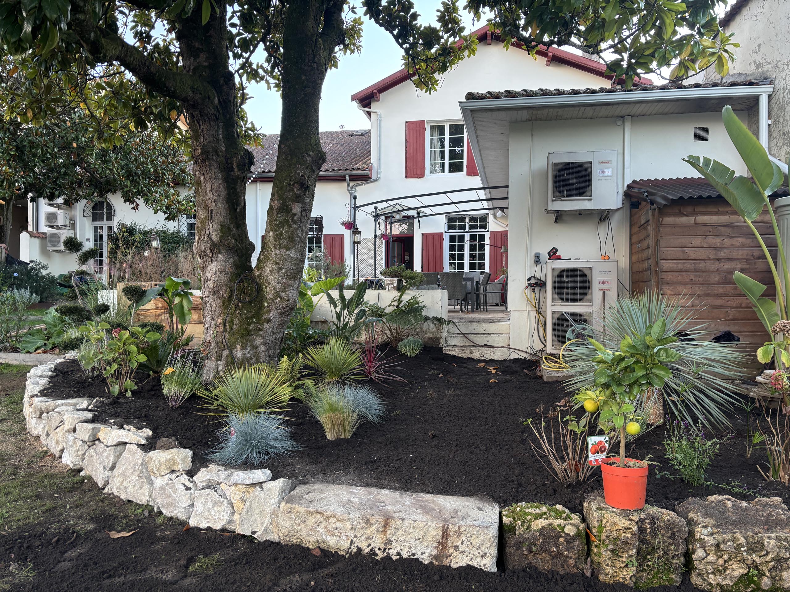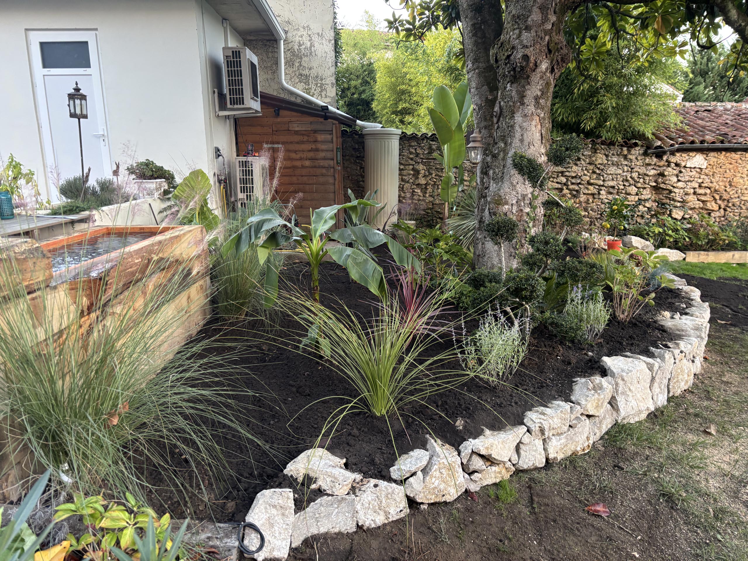 - Massif exotique harmonisé : Intégration de pierres naturelles et végétaux exotiques pour un jardin à la fois esthétique et durable.